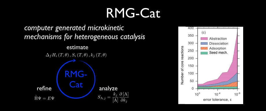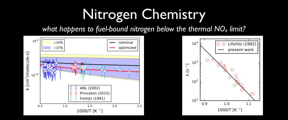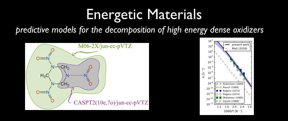 Our group focuses on chemical kinetics. We combine experimental techniques with electronic structure methods, statistical mechanics, and uncertainty quantification to provide accurate, predictive models for complex reaction networks in energy conversion. Most of our research focuses on elementary reactions in high-temperature and high-pressure systems, such as combustion, heterogeneous catalysis, energetic materials, and propellants.