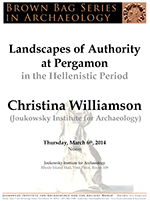 Christina Williamson, a visiting scholar in archaeology at the Joukowsky Institute, will discuss her current research in an informal talk titled, "Landscapes of Authority at Pergamon in the Hellenistic Period." Pizza and soda will be provided, or feel free to bring a lunch.