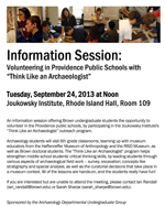 An information session offering Brown undergraduate students the opportunity to volunteer in the Providence public schools, by participating in the Joukowsky Institute's 'Think Like an Archaeologist' outreach program.