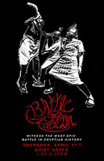 On Thursday, April 17th, history will be (re)made on the quiet green of Brown University, as members of the Joukowsky Institute class Archaeology 1630: Ancient Egyptian Warfare reenact the Battle of Kadesh. Occurring in the second millennia BCE, the Battle of Kadesh pitted the Egyptian forces of Ramses II against the Hittite armies of Muwatalli II. The goal of our project is for the class to gain a deeper understanding of warfare in the ancient world and for the Brown and Providence communities to be exposed to an important aspect of ancient cultures. The event is entirely student-organized. Every detail, including costumes, weapons and a script of the battle faithfully recreated from primary sources, will be done by students of the class.
