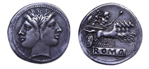 This Roman Republican coin (RRC 28.3) is generally called a quadrigatus (silver didrachm), a name which is at least as old as Livy (22.52.2; 22.54.2; 22.58.4) and Pliny the Elder (33.46 “notae argenti fuere bigae atque quadrigae; inde bigati quadrigatique dicti; the marks of silver [given to soldiers during the Second Punic War] were two-horse chariots and four-horse chariots; for this reason they are called ‘bigati’ and ‘quadrigati’”). It is the reverse of the coin to which Pliny refers, where one finds Jupiter riding in the four-horsed quadriga, to the right, holding a scepter in his left hand, while preparing to hurl a thunderbolt with his right hand; the quadriga is driven by the winged goddess Victory. A lined border around the reverse is still slightly visible, and inscribed in incuse below the image, in exergue, is the prominent name “ROMA.” On the other side of the coin, the obverse, is a portrait of two young gods, who are probably the Dioscuri (transliterated from the Greek "Διόσκουροι"), literally “the sons of Jupiter,” Castor and Pollux (or Polydeuces), fraternal twins of whom only one was technically said to be the son of Jupiter (usually Pollux), while the other was said to be the son of Tyndareus, the king of Sparta and husband of their mother, Leda. The gods are presented in the style of Janus, another god who was depicted with two faces, on the front and back of his head, and so their portrait is here called “Janiform.” They are wearing crowns of laurel, which were granted to the victorious, and are framed by a dotted border. |