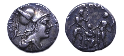 On obverse of the coin is a bust of Mars facing right, draped and helmeted (the helmet has long crest, and a plume on each side). Behind Mars is an X, denoting that the coin is a denarius worth 10 asses, and T I • VET (as a monogram) moving downwards. The reverse contains an oath-taking scene in which two warriors face each other, one bearded and without armor, one beardless and in armor; each holds a spear in their left hand and a sword in their right. Their right hands touch a pig held by a central figure kneeling between them; ROMA is inscribed above. |