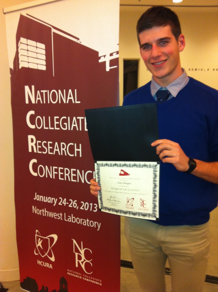 Congratulations to Cory Hargus, who won the "Award of Excellence" at the National Collegiate Research Conference, held in Cambridge, MA, this past Saturday. Cory won the award for his poster presentation on his research conducted in our group, entitled "Solar Enriched Biofuels Via Oxidizable Metal Catalysts". Well deserved!